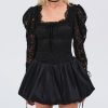 Designed for the elegant Muse, the Waverly black mini dress evokes a vintage aesthetic with its square neckline and puff sleeves. Crafted in lace, this black lace dress is contrasted with a taffeta bubble skirt and finished with a velvet ribbon that runs through the neckline.
