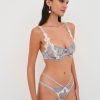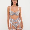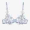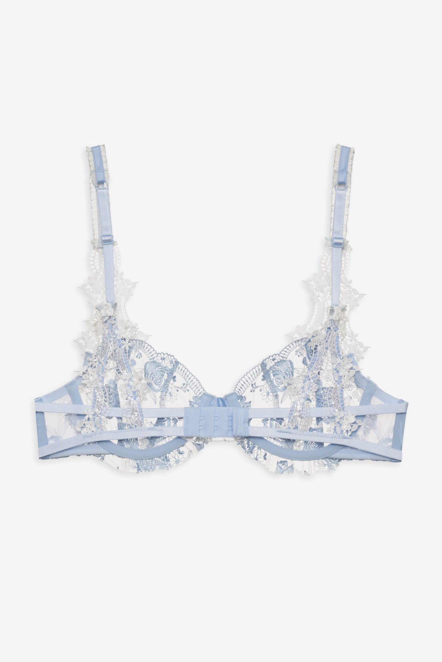 Frolick behind the rose bushes in the Zoeva blue underwire bra—a romantic unlined bra with intricate rose embroidery and vintage-inspired scalloped white lace trims.